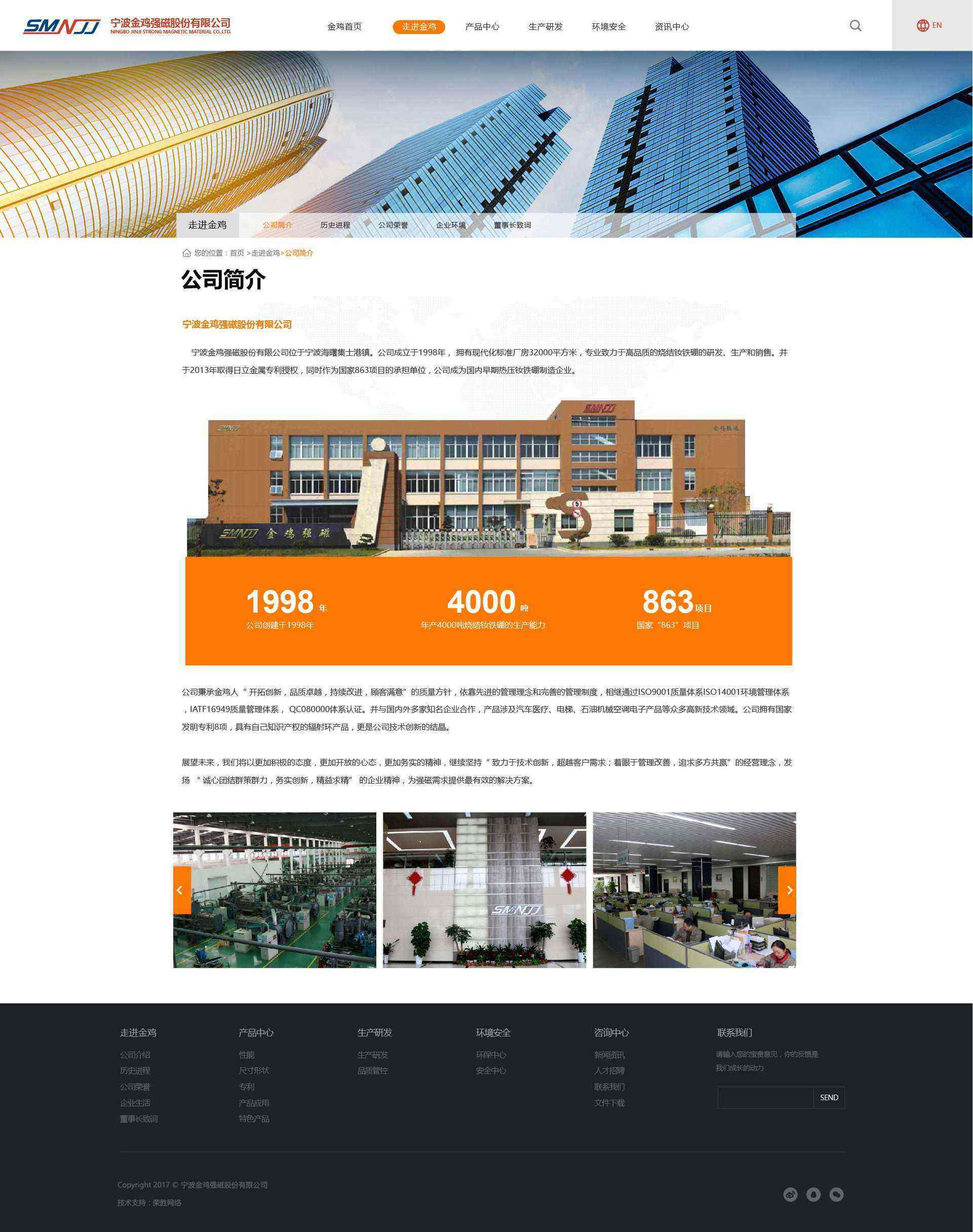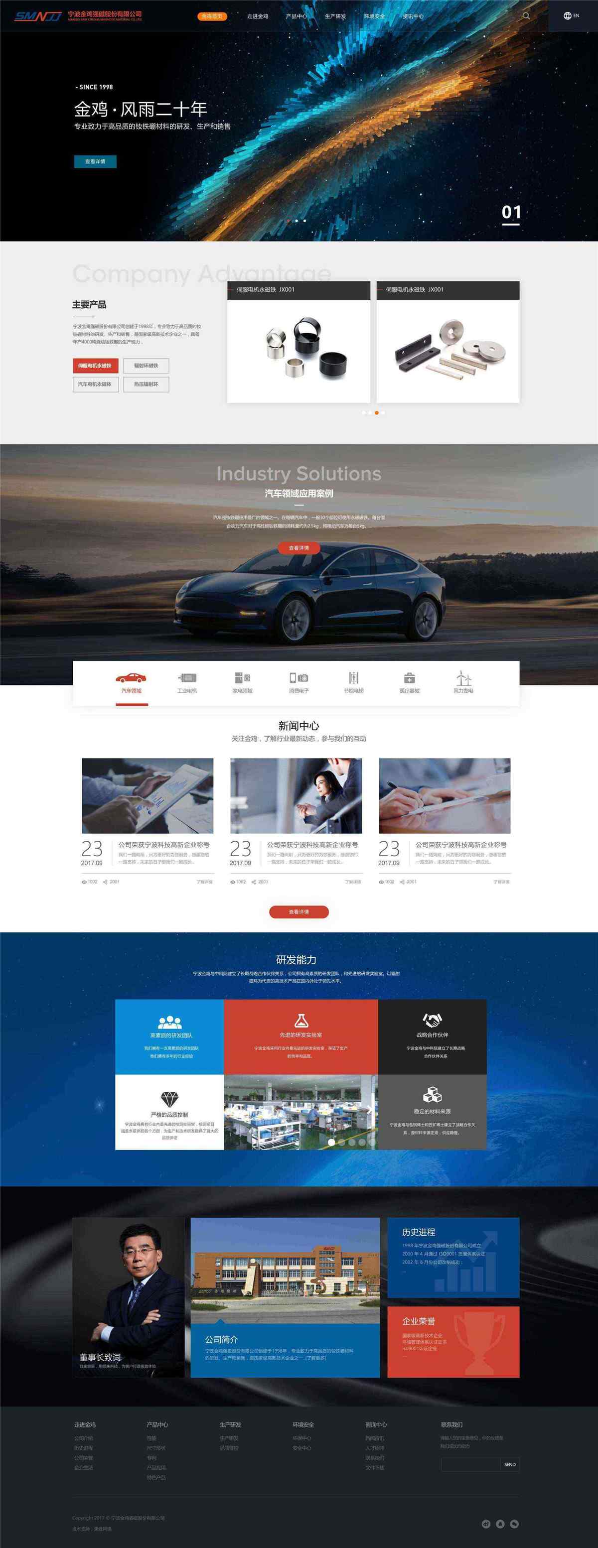 寧波金雞強磁股份有限公司位于寧波海曙集士港鎮(zhèn)。公司成立于1998年, 擁有現(xiàn)代化標(biāo)準(zhǔn)廠房32000平方米,專業(yè)致力于高品質(zhì)的燒結(jié)釹鐵硼的研發(fā)、生產(chǎn)和銷售。并于2013年取得日立金屬專利授權(quán),同時作為國家863項目的承擔(dān)單位,公司成為國內(nèi)早期熱壓釹鐵硼制造企業(yè)。